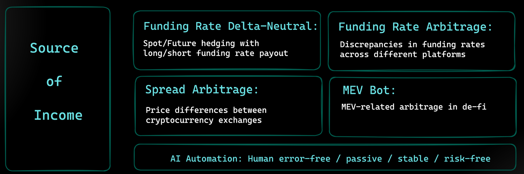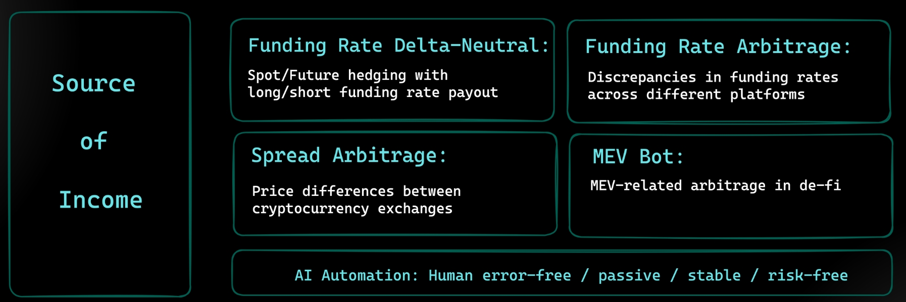 In the near term, the primary source of income comes from our AI-trained trading agent Kira, who captures delta-neutral and arbitrage opportunities. Our major strategies currently include Coin-Futures Funding Rate Farming, Spread Arbitrage, and MEV (Miner Extractable Value).